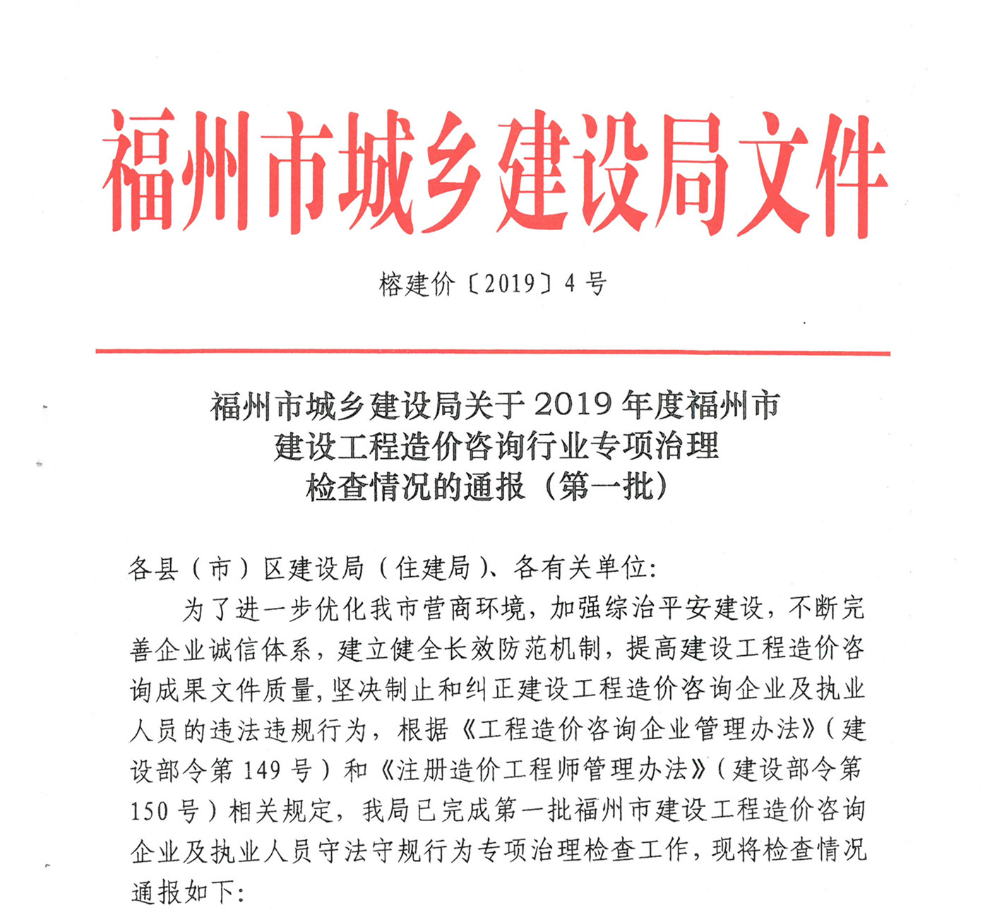 被列入福州市城乡建设局通报表扬的建设工程总咨询企业名单。公司将再接再厉,继续为广大业主提供最优质的造价咨询服务。