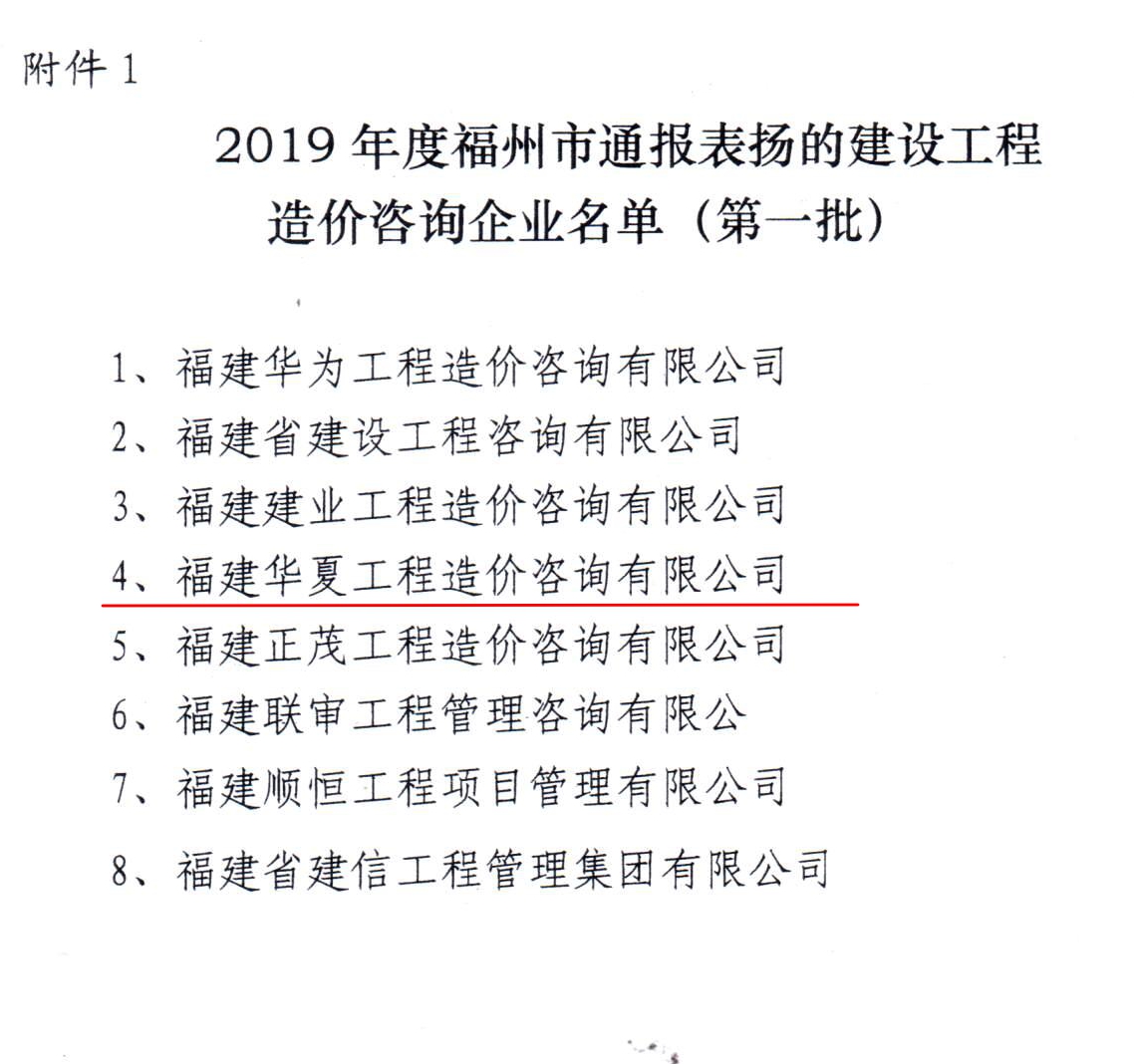 我司名列2019年度福州市通报表扬的建设工程造价